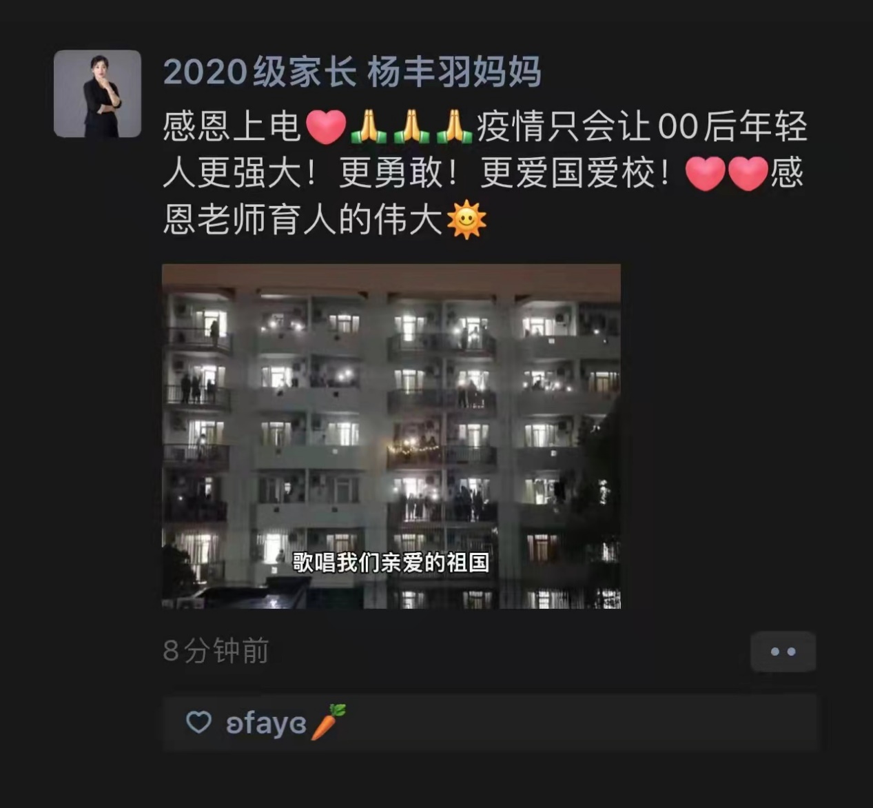 在这次的“以声传情”的活动中,不仅引起了上海其他各大高校的关注,“浦东发布”和“上海高职”也积极转发,将这份温暖送到更多人的心中。同时,本次活动还得到了许多家长的理解、认同与支持,这样欢乐的氛围也让关心学生的家长们,感受到学院抗疫的态度和决心!用实际的行动抚慰了他们的担忧和牵挂。