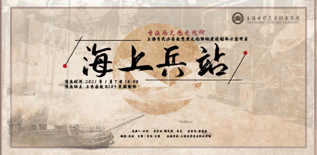 2020年1月7日,上海市民办高校党建和思政工作创新示范项目、戏剧影视表演专业毕业大戏、校园舞台剧《海上兵站》在学院B203实验剧场举行首演并取得圆满成功。上海市民办高校党工委王庆书记、上海电影艺术职业学院顾成明书记、表演艺术中心曲慧佳主任及广大师生莅临现场,广西民族中等专业学校25名师生赶赴首演现场学习交流。