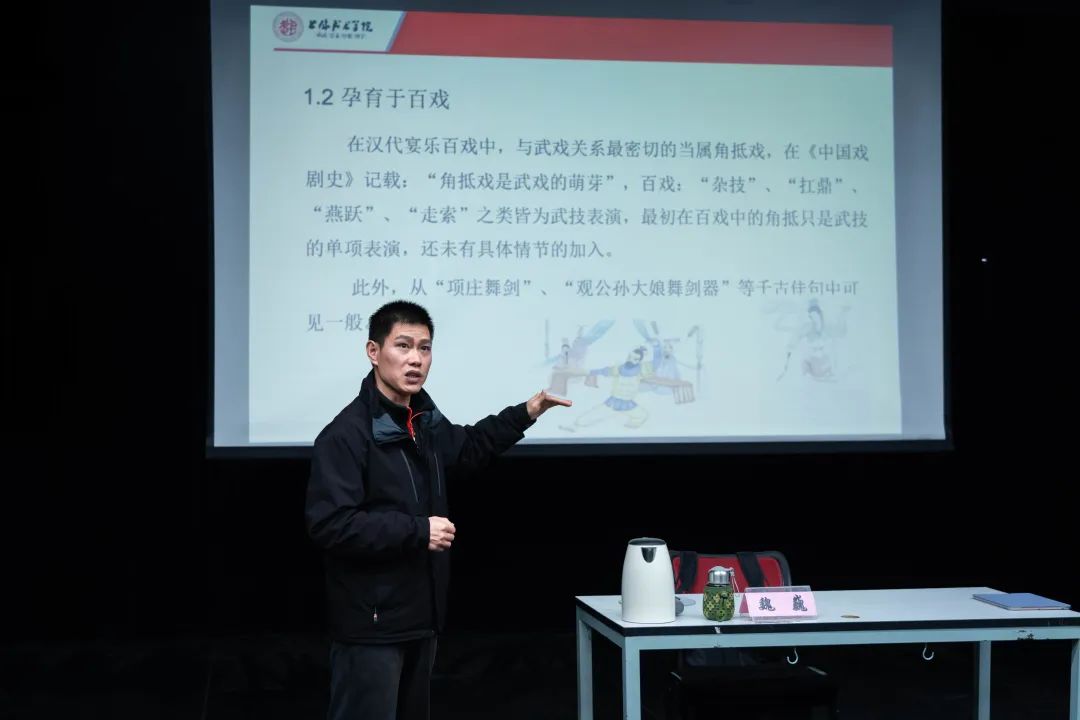 魏老师首先向同学们介绍了“武戏”的产生和发展。武戏缘于祭祀,孕育于百戏,发展于杂剧。武戏的源头可以追溯到远古的祭祀活动,在汉代宴乐百戏中,与武戏关系最密切的当属角抵戏,最初在百戏中的角抵只是武技的单项表演,还未有具体情节加入。到清代,地方戏为“武戏”的兴起搭建了平台,许多剧种都把“武戏”作为压轴大戏,剧目大量取材于历史故事,此后“文”“武”出现了分工,武行的划分培养了大量专攻武戏的演员,为武戏的成熟奠定了坚实的基础。