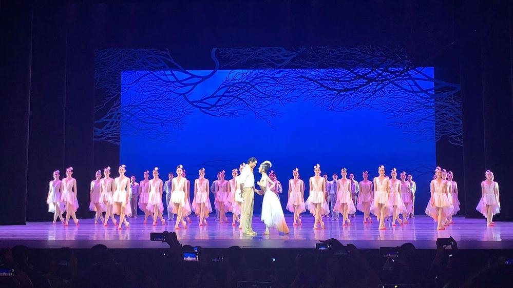 舞剧《朱鹮》融合了西方古典芭蕾舞的优雅华丽与中国传统舞的婉约灵动,凭借质朴简约的舞美设计,写意的舞蹈语汇,强烈的视觉冲击,以及演员们的精湛表达,为观众带来美轮美奂的感官盛宴。昨晚舞台上,鹮仙与群鹮时而飞舞,时而嬉戏,时而栖息,如丹青水墨般跃动,以曼妙的肢体语言、灵动的足尖叙事,刻画出朱鹮“涉”“栖”“翔”的优雅姿态。上海歌舞团荣典·首席演员朱洁静、王佳俊领衔主演,以绵延三生三世的缘分,讲述了朱鹮与人类之间曲折而凄美的故事,蕴含着如诗如歌的意象画面和情感空间。