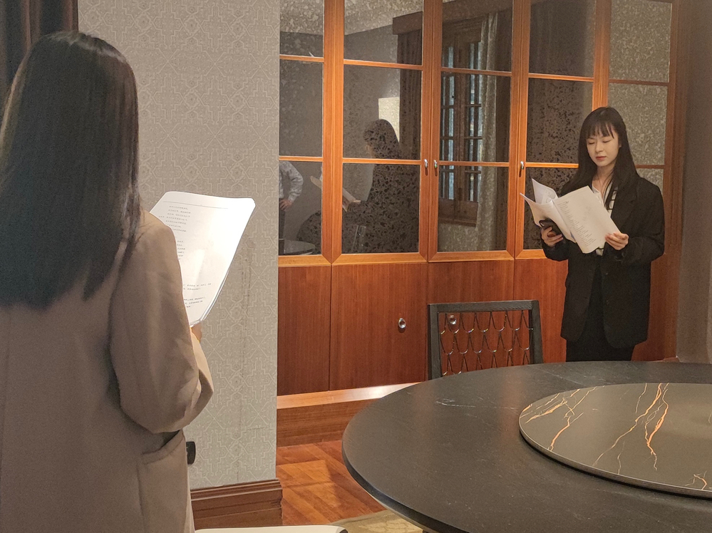 老师们似乎发现了我波动的情绪,导演施晓卿老师耐心地和我谈心,鼓励我让我重拾信心;毕歆阳老师非常敬业地给予我表演上的指导;于暕老师与万姝含老师让我不用紧张放平心态,有不理解的问题都可以随时找她们;陈锋老师与我说了许多他对角色的理解。10月23日,李瑞祥院长带着我们去思南公馆参观了现场,并亲自参与排练,让我们对作品有了更加具象的感受。徐志摩与陆小曼的旧居,处在上海非常繁华的街区,在那时陆小曼该是什么样的生活状态呢?这让我陷入了思考,李院长带着我们又一次深入探讨了每一位角色的理解,丰富人物内在的心理支撑。有史可查的人物艺术形象,辨析剧中故事情节的虚实尺度,深刻挖掘剧作的内涵意义,参照与剧中人物相关的史书记载,结合剧中的规定情境,对剧中人物的历史背景及其性格构成的种种因素,进行组织和想象。使史料、剧情在演员想象中有机地融为一体,让舞台的艺术形象不仅有历史的真实和艺术的真实,而且还有某种象征意义的真实……