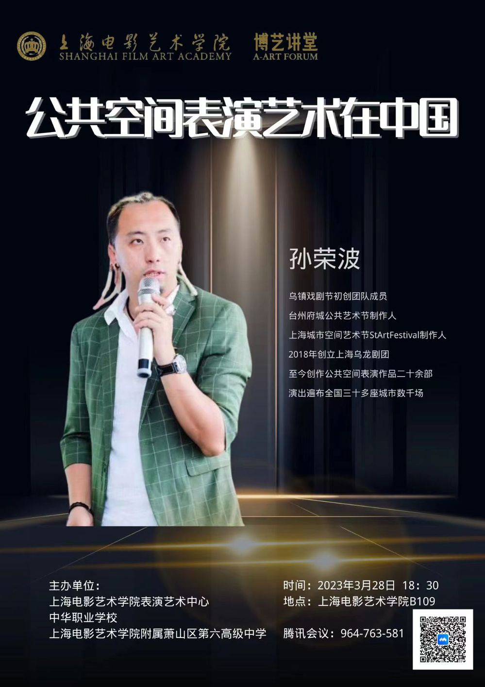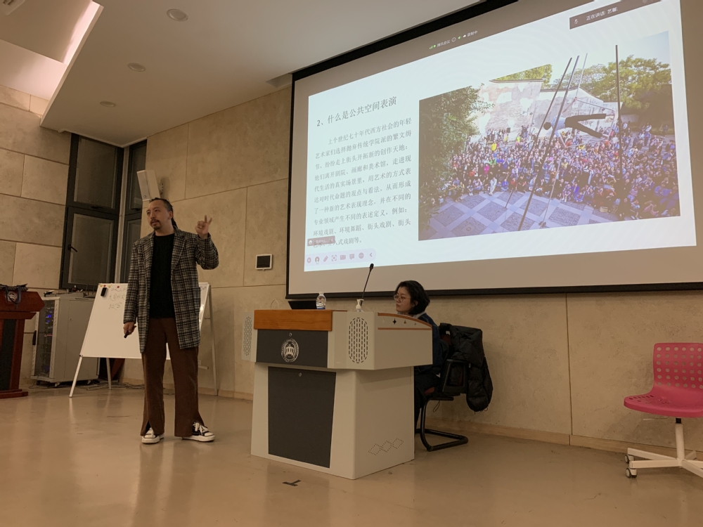 2023年3月28日晚18:30,上海电影艺术职业学院B109开展了一场关于《公共空间表演艺术在中国》的讲座。主讲人是来自乌镇戏剧节的初创团队成员、上海乌龙剧团的创始人孙荣波老师。
