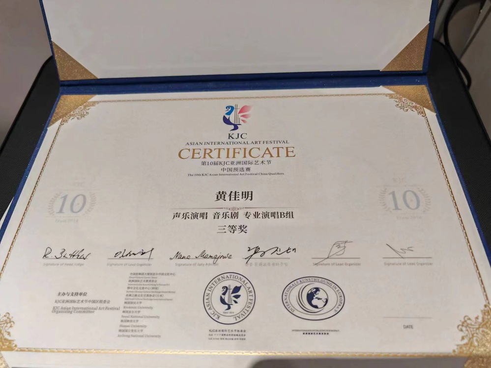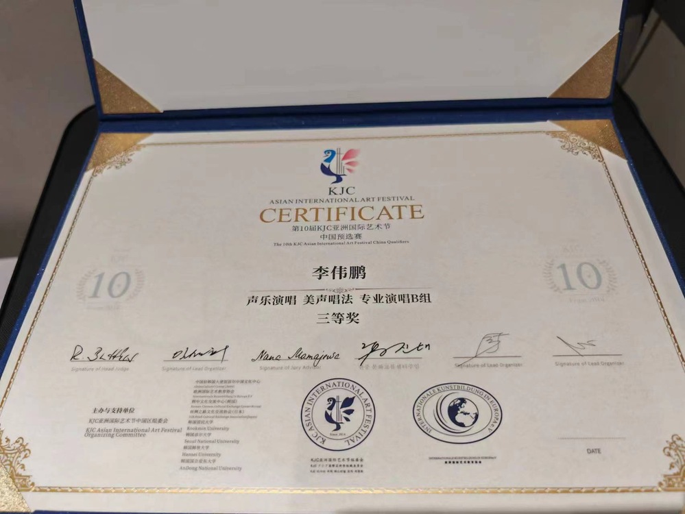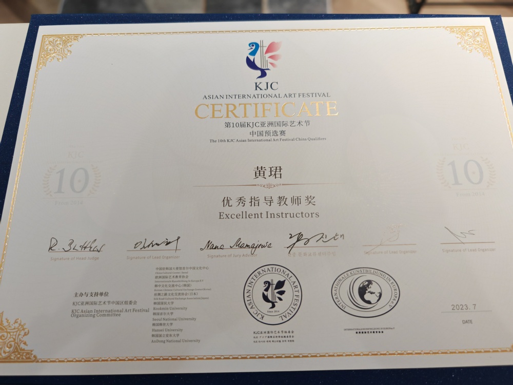 2023年7月,在第10届KJC亚洲国际艺术节中,教师黄珺荣获优秀指导教师奖;歌舞表演专业学生李伟鹏同学获得声乐演唱--美声唱法专业演唱B组三等奖;陈婷赟同学获得声乐演唱--流行唱法专业演唱B组一等奖;音乐制作专业学生黄佳明同学获得声乐演唱--音乐剧专业演唱B组三等奖。祝贺以上获奖的老师和同学们!