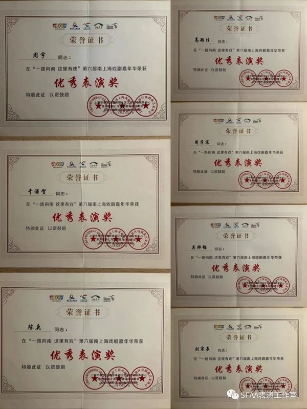 演艺学院2022级戏剧影视表演1班的周宇、于潇贺、刘宸辰、周子宸、吴烨锦、高颖佳、陈奂同学荣获2023“一路向南 这里有戏”第六届上海戏剧嘉年华优秀表演奖!