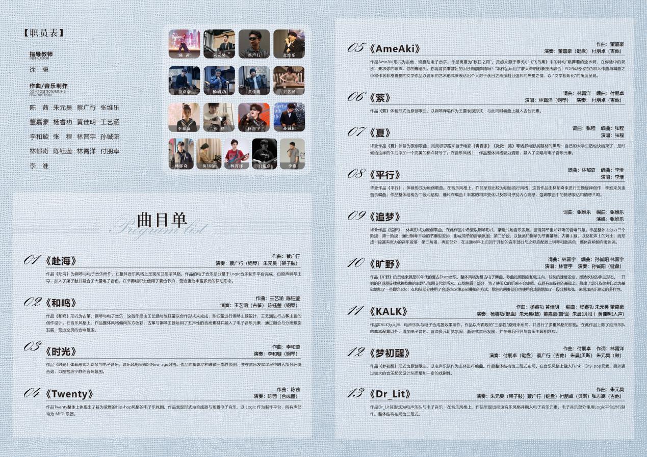 音乐会作品体裁形式由“传统乐器与电子音乐融合”“电声乐队与电子音乐融合”“原创歌曲”三种类型单元组成,多元风格融合的原创音乐作品,力图呈现出精彩的音乐现场。