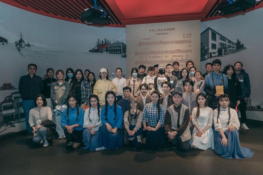 图1 演出的学生与现场工作人员合照 随着五一假期的来临,一场精彩绝伦的音乐剧表演也在国歌展示馆上演。学校音乐剧表演专业的学生们,为我们带来了《国之当歌》青春版的精彩演出,让我们共同回顾这场视听盛宴!