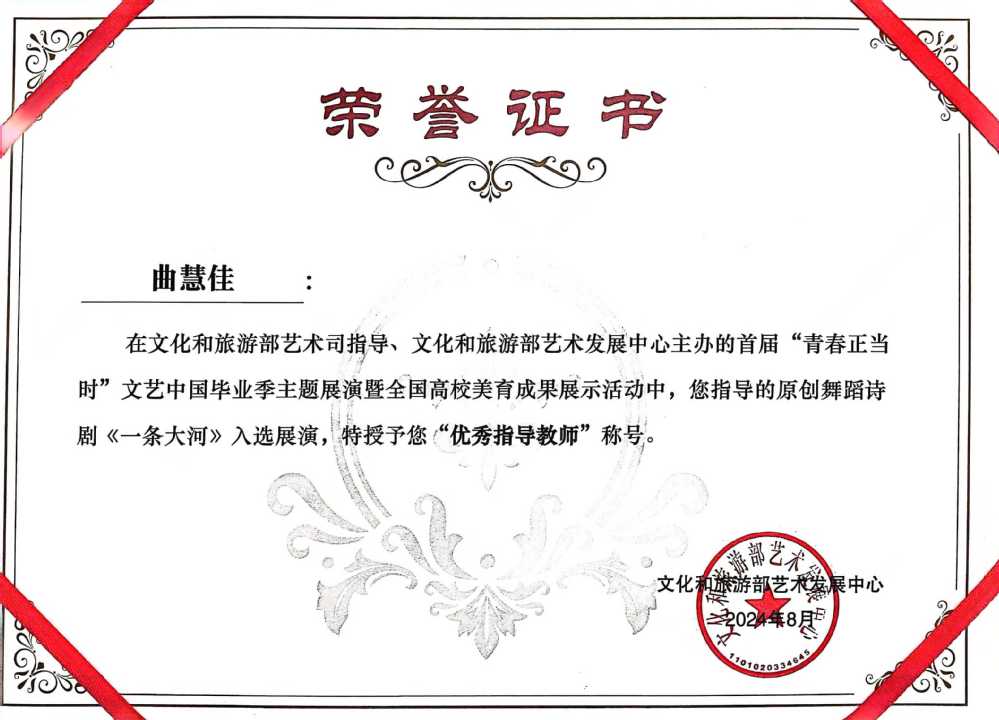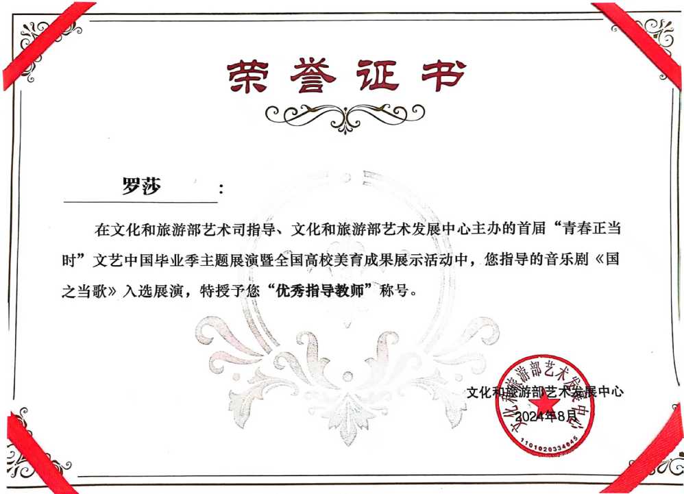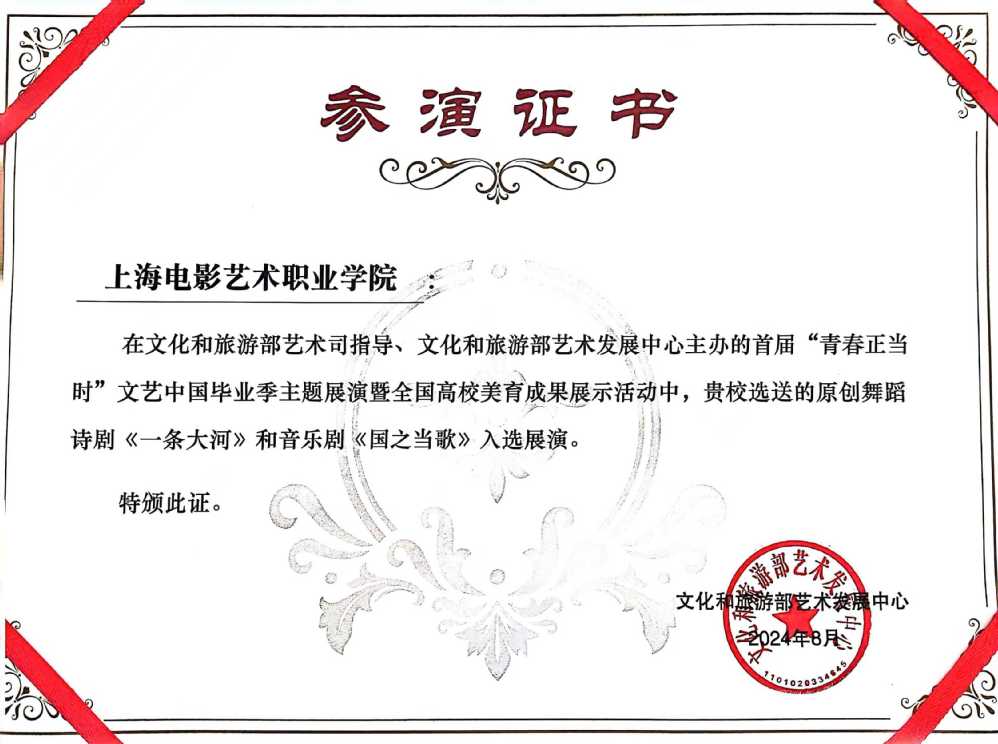 《一条大河》与《国之当歌》两部精彩作品的成功展演,不仅展示了学院师生在艺术领域内的卓越追求与不懈努力,更成为了对精湛艺术表现力的一次深情颂歌。文化和旅游部艺术发展中心对演艺学院曲慧佳院长及音乐剧表演专业罗莎主任授予“优秀指导教师”称号,这一荣誉不仅是对她们个人专业能力和教学成就的认可,更是对整个学院精益求精教育理念的肯定。未来学校将致力于持续推动艺术创新,深化教学,提供丰富实践,让每位学生都能在此实现自我,贡献社会,共绘艺术新篇章。