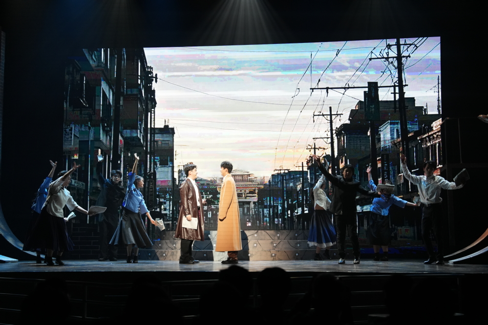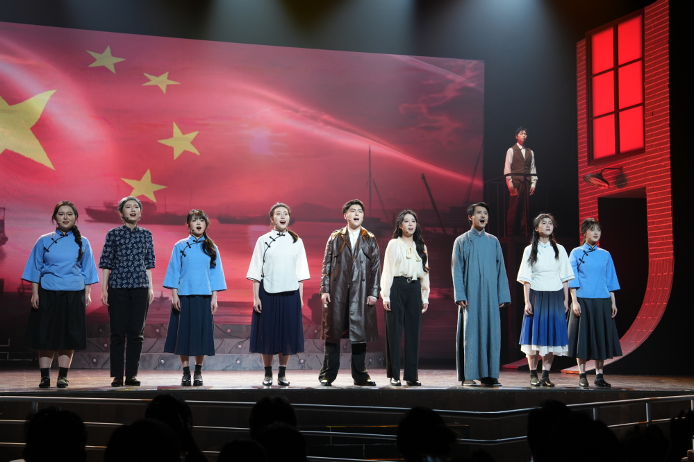 《向阳而生》以聂耳从云南山野少年成长为人民音乐家的蜕变历程为主线,聂耳的挚友张天虚探寻聂耳的死因为副线,双线叙事以聂耳经由田汉介绍光荣加入中国共产党为交汇点,也是全剧的高潮。剧中,音乐与舞蹈化身为时代的呐喊:聂耳与张天虚的生死守望、与田汉的创作碰撞、与白虹的艺术共鸣,在舞台上汇聚成一股磅礴力量。灯光与音符共振间,观众不仅感受到革命年代的烽火硝烟,更触摸到一代青年以艺术为武器、用生命点燃民族希望的赤诚之心。表演学院学生徐泽阳(饰聂耳)感慨道:“扮演聂耳让我真正理解了艺术家的热血与责任。舞台上,我不仅是一名演员,更是一名历史的讲述者。”