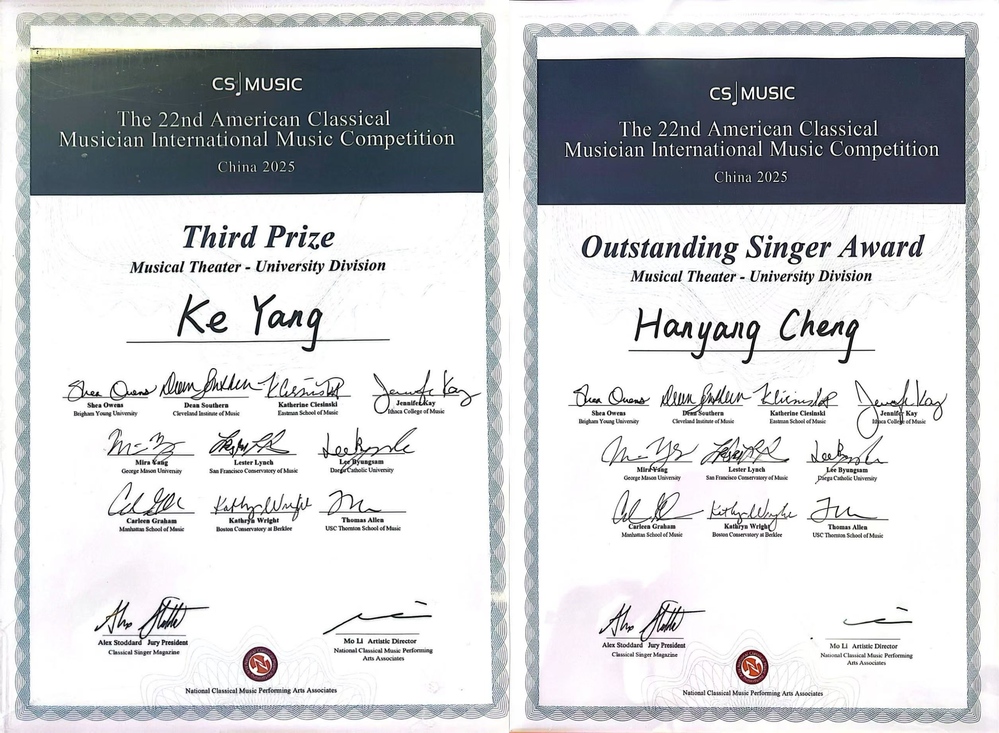 23级音乐剧2班杨柯同学获奖感言: 非常荣幸能获得2025第二十二届美国古典音乐家国际音乐比赛“音乐剧大学组”三等奖。获奖之际,我深感荣幸。这份荣誉不仅是对我努力的认可,更是对我未来的鞭策。通过此次比赛我能及时发现自己的不足,在其他选手出色的发挥中取长补短使自己变得更好。能这份荣誉的背后离不开老师以及学校对我的教导和培养。感谢我的声乐老师黄珺老师在专业上对我的严格要求和悉心指导的同时给予我的鼓励,更要感谢上电音乐剧系为我们提供了许多舞台实践的机会,让我在比赛中能从容应对。