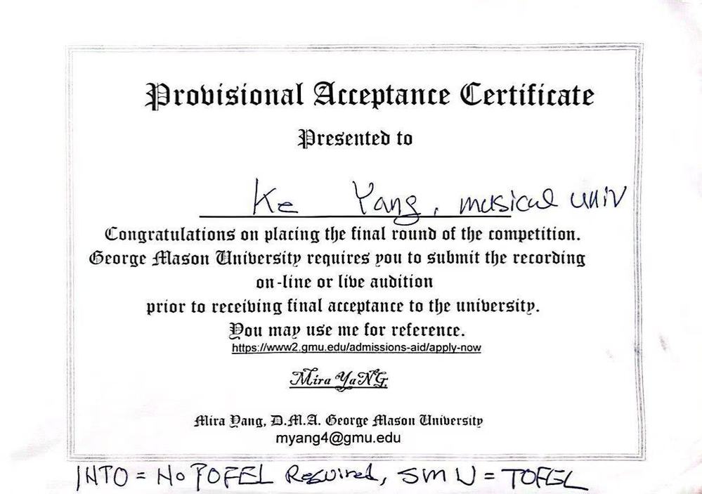 图3 杨柯同学获得美国乔治梅森大学艺术学院offer