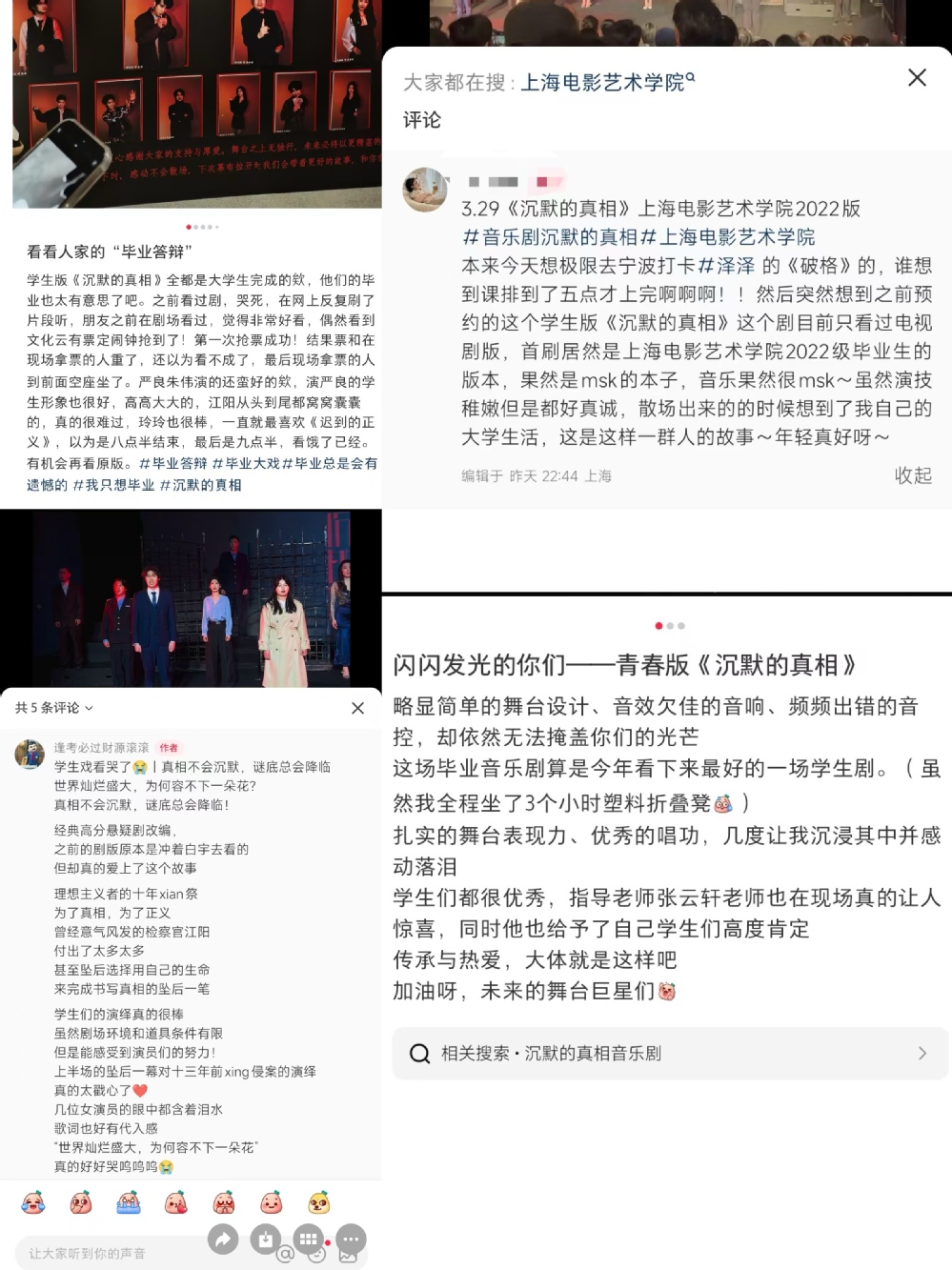 2025年3月29-30日,演艺学院音乐剧表演专业22级1班毕业大戏《沉默的真相》在浦东文化馆震撼开演,现场座无虚席,观众反响空前热烈!演出结束后,社交媒体迅速被“自来水”刷屏,无数观众在小红书、微博等平台分享观后感:“每一幕都直击心灵”“演员的爆发力让人泪崩”“音乐与剧情完美交织,仿佛置身真相漩涡”。剧中《花》《雨夜》等经典唱段被观众反复提及,更有观众感慨:“最后那句‘你听见它的求救了吗?’让我彻底破防,久久无法平静……”。
