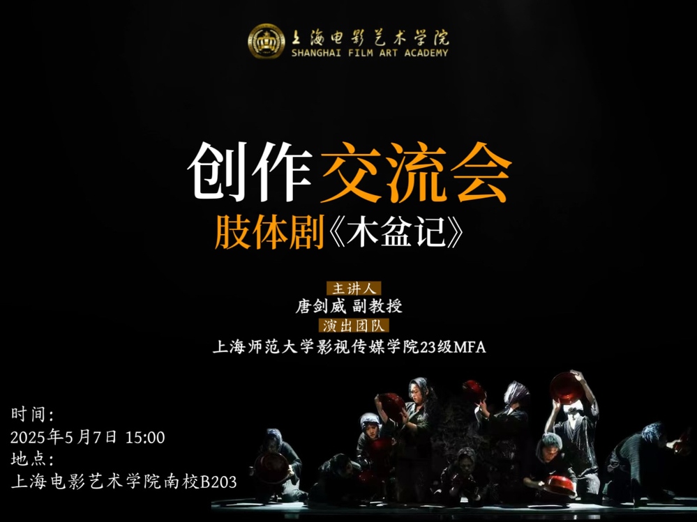 5月7日,上海师范大学表演系副教授、上师大肢体剧工作坊创始人唐剑威老师携23、24级表演MFA原创肢体剧作品《木盆记》走进上海电影艺术学院戏剧影视表演专业开展演出交流活动。本次活动由戏剧影视表演专业负责人王雅主持,赵炳翔副校长、音乐剧表演专业负责人罗莎、施晓卿、柴瑾等老师们协同表演专业23、24级同学们共同参于此次交流,此次以“肢体语言的破界与共生”为主题,通过剧目展演、创作分享、两校师生对话三大环节,呈现了一场关于表演艺术教育的深度碰撞。