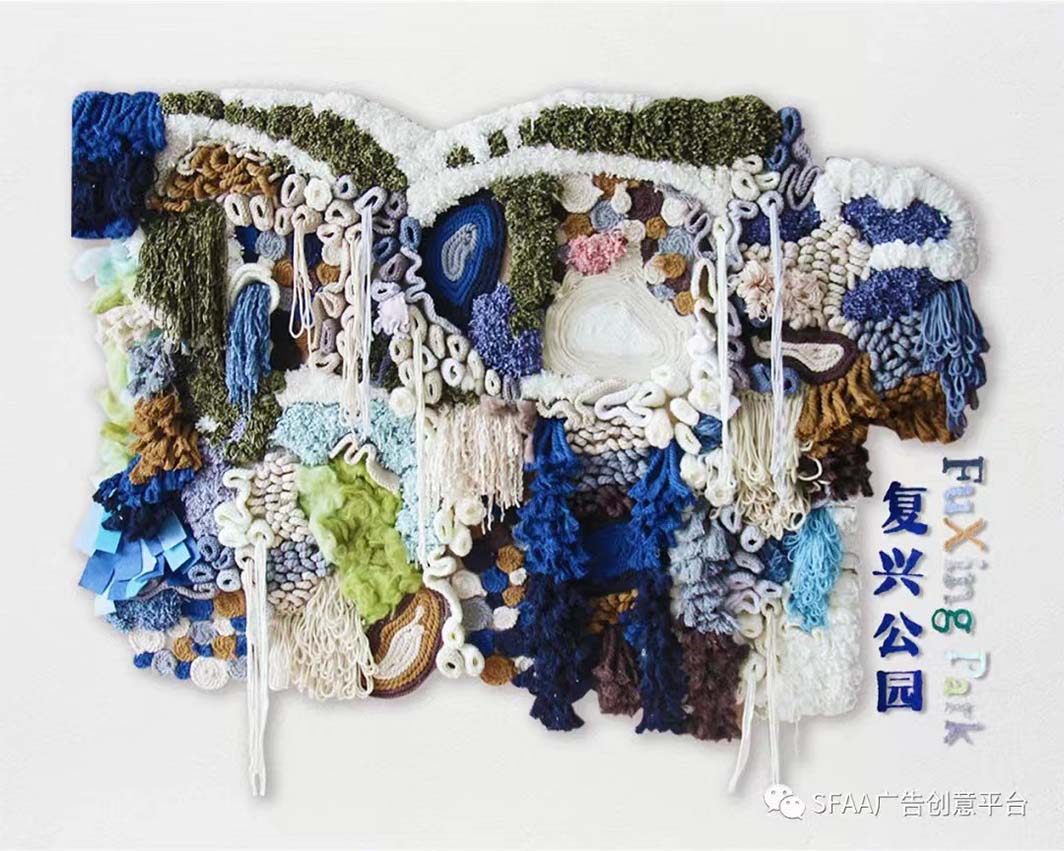 该组作品以上海公园鸟瞰图为素材,将公园中的各个区域用色彩编织的形式与毛毯相结合的手法呈现在观众面前。毛线,棉绳等特殊的点、线、面元素与公园中的花、草、树、木等元素相映成趣,加之特殊材质特有的后现代氛围使得画面冲击力极强。