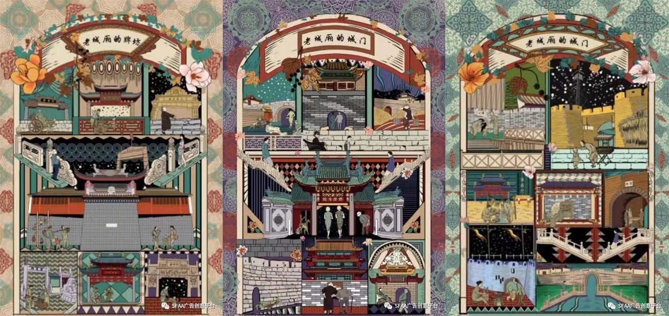 该组作品运用木板激光雕刻以及拼贴的上色手法,体现出上海市静安区历史保护建筑的厚重历史,图形设计体现建筑的特点。画面整体以长构图的形式让人有种游走在静安区道路上的真实,建筑的立体感与真实地理位置的呈现,使人有身临其境之感。