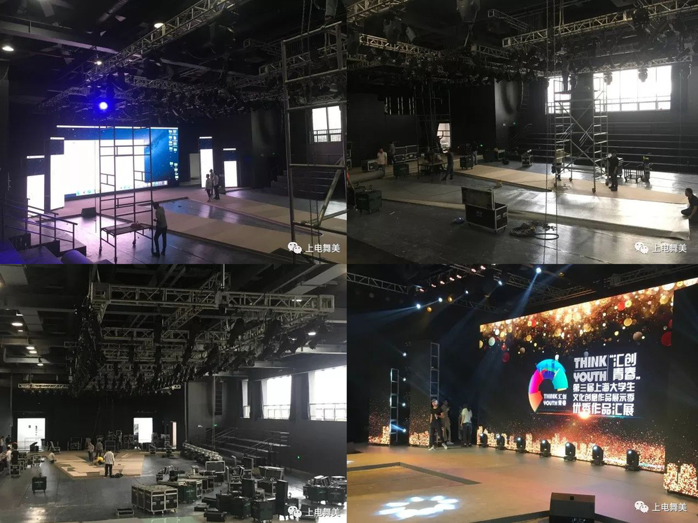 舞台美术设计与制作专业先遣部队,在活动开始前两日进入现场进行监督学习装台。为确保每一处设计细节得到落实,搭建团队人员监督确认秀场每块器材的装台、每张大屏的拼接、每盏灯的位置,力求为活动做好最充足的准备。