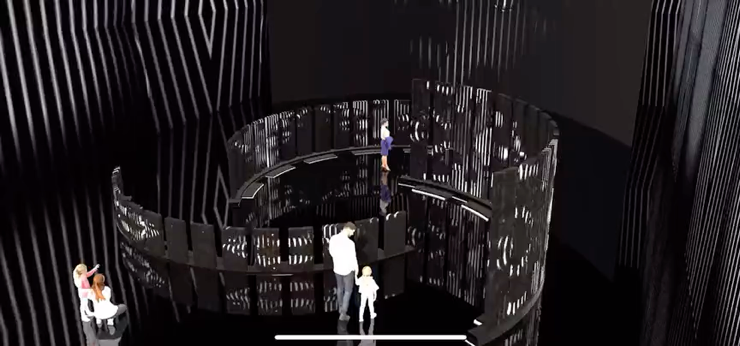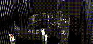 我的作品名字叫《Prison Life囚生》,舞台的灵感来源于波兰艺术家理查的作品,只有站在食物链顶层得人才能不用被每天朝九晚五的生活压迫,阶梯式的舞台可以看出一个人的地位所在,人在不同的阶层会有不同程度来自于生活的压迫,地面使用亚克力反光材质,让多媒体投影在地面上做呼应,从而体现出人被关在生活的牢笼中,人们拼命的挣脱,所以我想到将视频也同样作为道具呈现在舞台上,我的视频以线条为牢笼,装置以牢笼里人的层次阶梯为主导从而给观众呈现一个半沉浸式的舞台体验,让观众作为旁观者看牢笼中的人是如何让生活的,就像生活中,旁人看自己一样的视角。