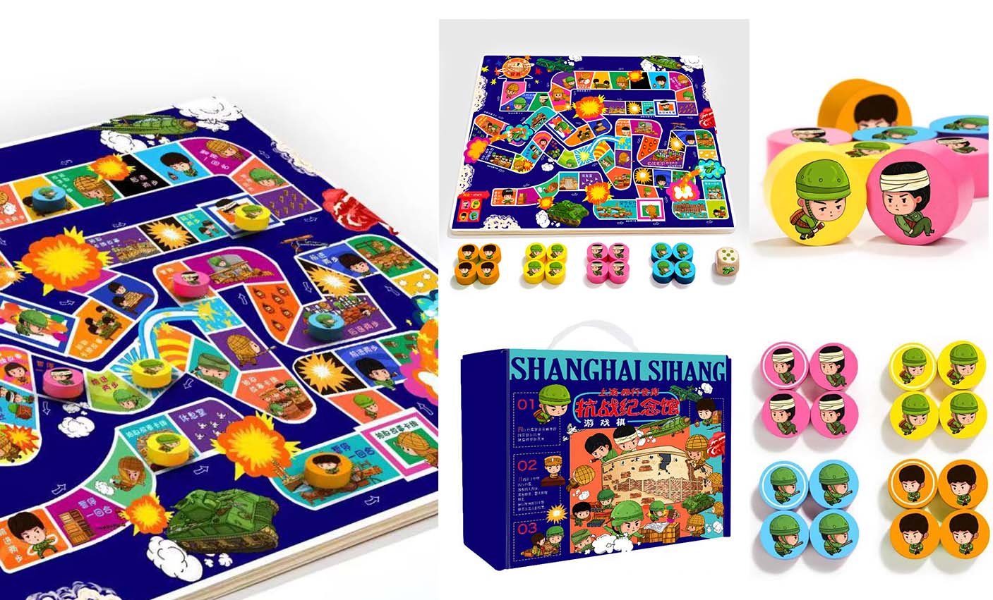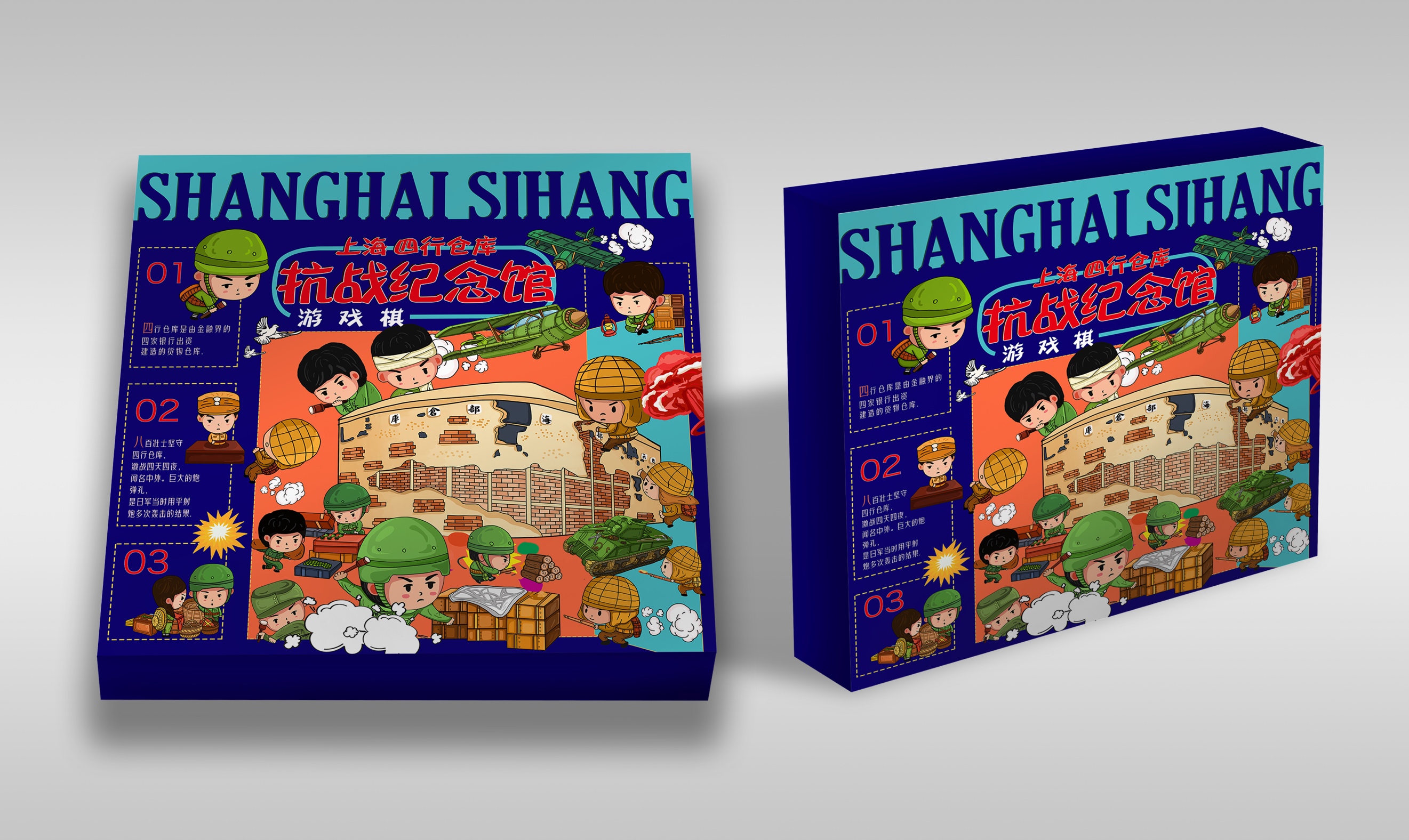 广告艺术设计专业将图案设计、产品设计、字体设计与编排、海报设计综合能力与该实训项目融合,并把课程思政内容融会贯通,在校馆合作过程中,开展“育人”课程。让参与这个项目的同学深刻了解并学习了“八百壮士”坚持抗战、绝不屈服的精神。旗面图案是根据四行仓库里面的展馆和重点内容进行制作,主要表现了战士们在当时环境下的状况和他们奋勇杀敌,不屈不挠的精神。整体以四行仓库的参观线路进行思考,棋盘内设计的动作走向表现了当时在四行仓库内的战士们坚守阵地,奋勇杀敌的真实状态。有的战士在投掷手榴弹;有的战士在射击敌人;还有谢晋元将军带着士兵们手写遗书。通过游戏过程,我们可以获取到一个非常完整的四行保卫战的故事。整个棋盘色彩鲜亮,构图饱满,士兵形象生动可爱,脸部表情正义勇敢,年轻化的设计风格可以吸引更多的青年学生来关注和了解四行保卫战,了解爱国主义精神。