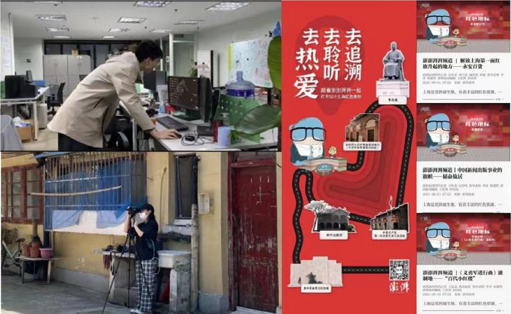 为激发同学们的创新意识,澎湃新闻特地为学院学生开创以“为建党百年献礼”为主题打造的“坚守者”“守护年味”“初心之路”等红色系列项目,其中新闻采编与制作专业学生完成49个成片,同时开通了“澎澎湃湃频道”以此来介绍上海150个不可移动的革命文物,发布于澎湃新闻客户端。如“《义勇军进行曲》灌制地——百代小红楼”“伴随着炮火声而生的中国青年新闻记者协会”“中共上海地下组织斗争史——刘长胜故居”等,均收获了较高的收视率。