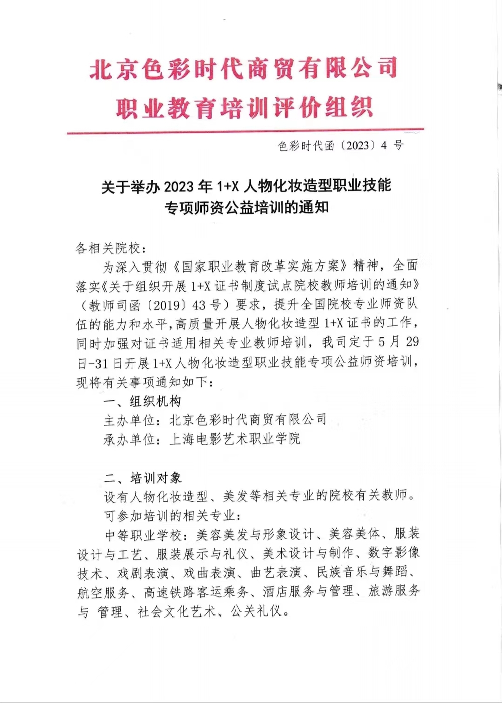 在此基础上,人物形象设计专业成功申报举办“2023年1+X人物化妆造型职业技能专项师资公益培训”,将于5月底和北京色彩时代商贸有限公司共同举办本次专项师资公益培训,并对培训合格者颁发1+X人物化妆造型专项师资培训结业证书,提升全国院校专业师资队伍的能力和水平,高质量开展人物化妆造型1+X证书的工作。