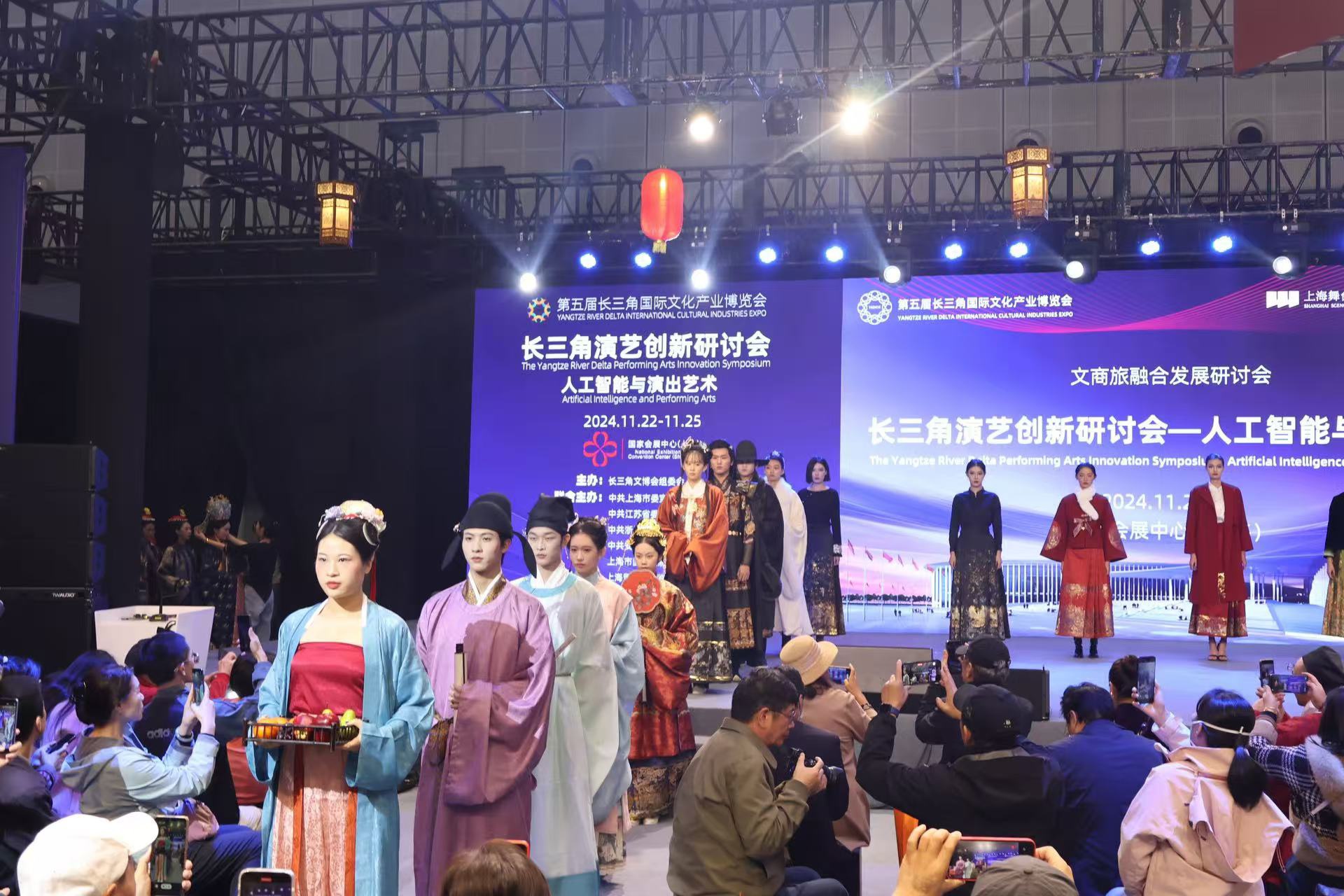 11月22-25日,“第五届长三角国际文化产业博览会”在国家会展中心(上海)盛大召开。“长三角演艺创新研讨会”作为开幕式中的一项重要活动,在专业研讨、案例分享以及沉浸演出等多种形式中圆满落幕。该研讨会以“人工智能与演出艺术”为主题,探讨在人工智能技术的飞速革新,不断渗透到演艺行业和产业的转化发展,大会邀请专家们对相关领域的实践探索、经验积累、学术探讨和理论研究及实践分享,为“未来演出艺术”的未来趋势提出了新要求。我校时尚表演与传播专业学生在现场进行汉服秀表演。
