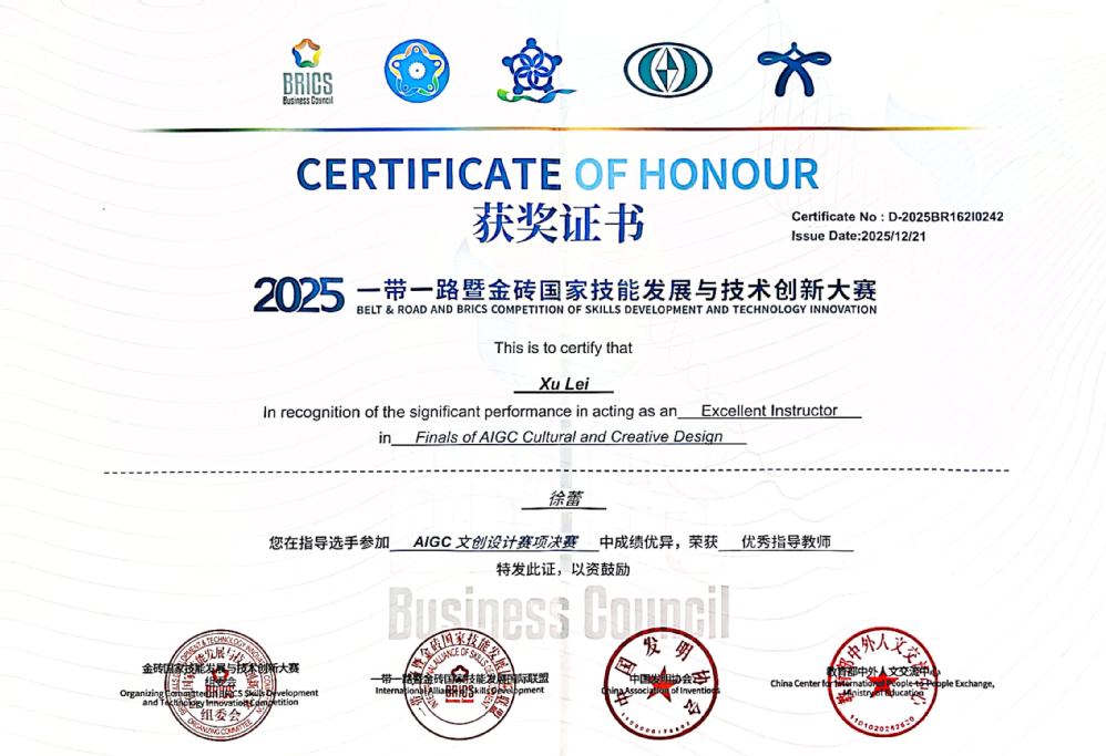 2025年12月21日,2025一带一路金砖国家技能发展与技术创新大赛“AIGC文创设计”赛道全国总决赛落幕。我校广告专业学生吕佳宇、王丽蓉历经区域赛、国赛、路演三轮严苛选拔,斩获各阶段一等奖,最终在全国总决赛路演环节卫冕高职组全国一等奖,强势入选“金砖未来技能人才库”。作为本次大赛中唯一获此殊荣的上海高职院校,充分彰显了我校广告专业在AI赋能文创设计领域的教学实力与技术优势。